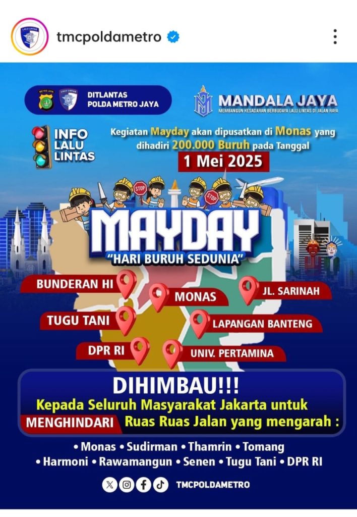 “Tidak akan ada penutupan jalan selama unjuk rasa Hari Buruh pada 1 Mei 2025. Namun, kepolisian akan memberlakukan rekayasa lalu lintas secara situasional untuk mengantisipasi kepadatan yang ditimbulkan oleh pergerakan massa menuju Monas,” jelas Dirlantas Polda Metro Jaya, Kombes Pol Komarudin.